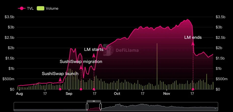 在 10 万个区块(大概两周)之后,SushiSwap 启动了流动性迁移,即,将所有 Uniswap LP 代币转移到 SushiSwap 上,并在 Uniswap 上兑换相应的代币对,之后继续使用代币来初始化新的 SushiSwap 流动性池。当迁移结束时,SushiSwap 已经累积了约 8 亿美元的代币,约占 Uniswap 当时流动性的 55% ,而同时 UniSwap 的 TVL 暴跌了约 4 亿美元。