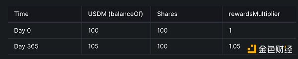 举例来说,如果rewardMultiplier从1.00增加到1.05,表示该年美债收益率为5%。那么用户持有100个USDM,就会因变基机制获得105个USDM,实现了收益的传递。