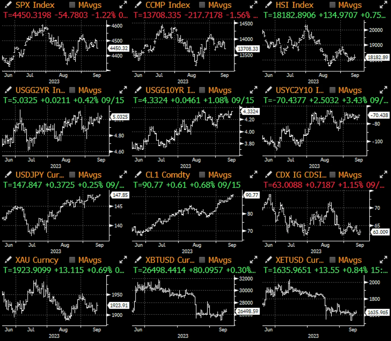 美债市场整周都未能得到缓解, 2 年期收益率周五收盘时高于 5.03% ,而 10 年期收益率则回到近期高点 4.33% ;市场定价认为本周三会议暂停加息的机率为 99% ,而预期 11 月加息的机率又回到了近期低点,仅有 30% 。