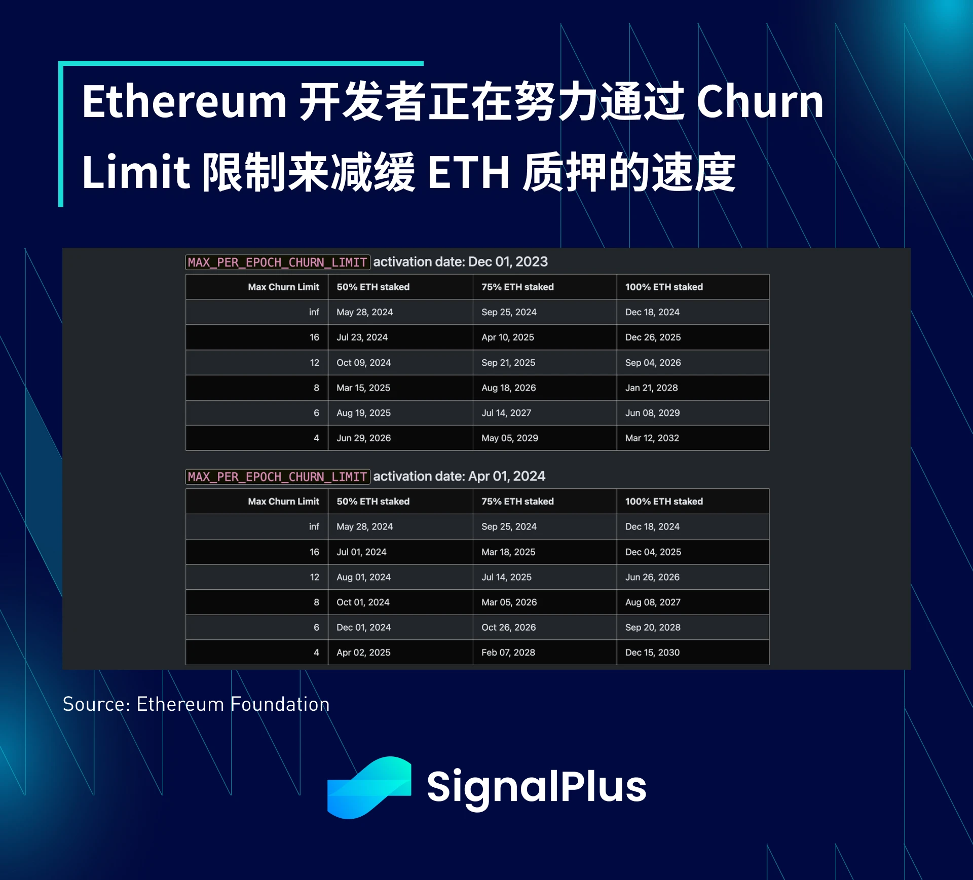 另一方面,目前约有 20% (410 亿美元)的 Ether 流通量已被质押锁定,用于产生长期收益,根据一些 Ethereum 开发者的估计,按照目前的速度,到明年 5 月将有近 50% 的 Ether 流通量会被锁定,而到明年 12 月这个比例可能会达到 100% ,为因应这个情况,他们推出了新的 EIP-7514 提案作为下次主要升级的一部分,通过设置新验证者数量(“churn change”)来减缓质押的速度,这可以将达到 100% 质押的时间推迟几年至 2030 年,作为一个暂时的解决方案,为社区争取时间直到找到更长期的解决方案。