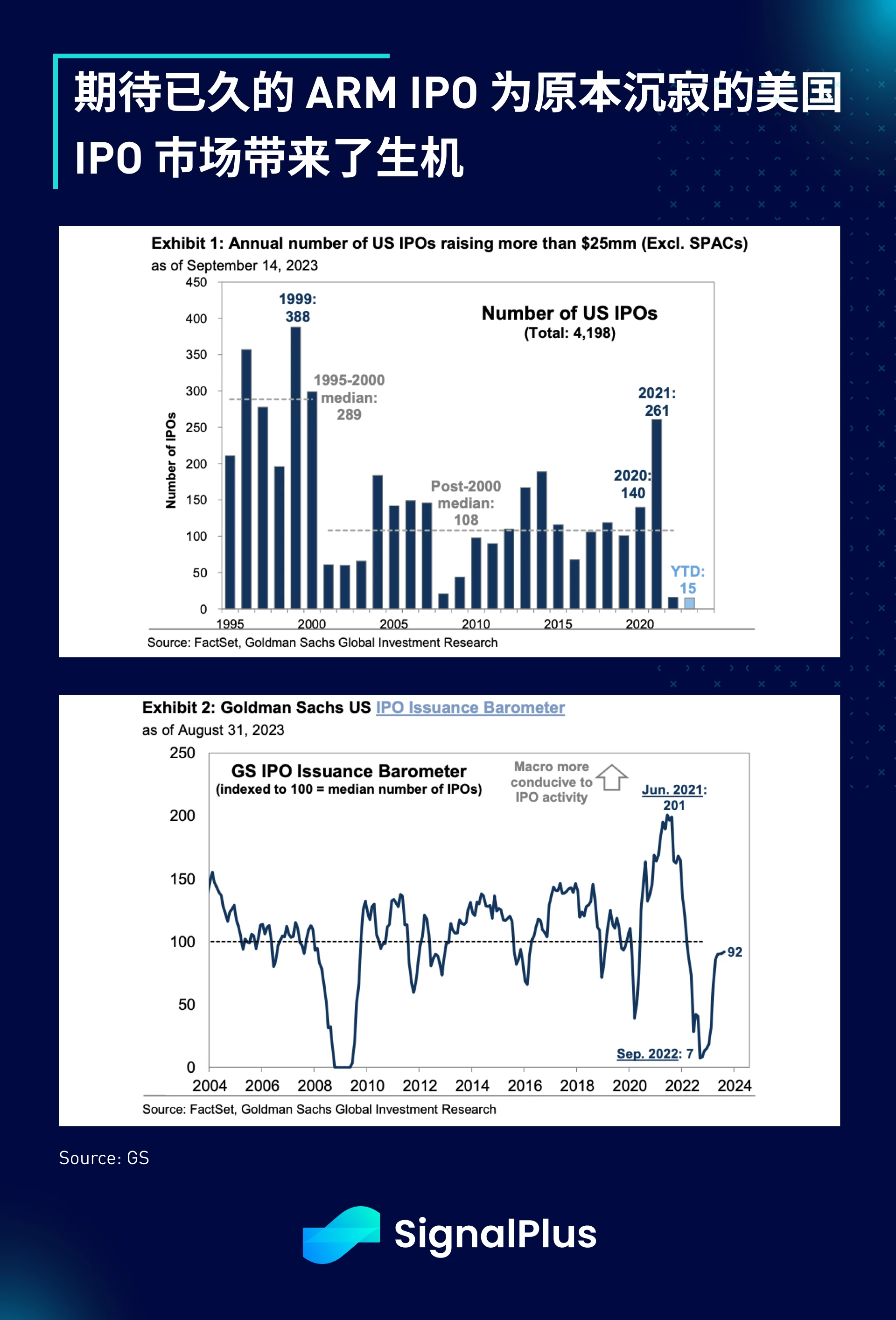 股市在上周的最后 48 小时相当活跃,首先是周四令市场期待已久的 ARM IPO,打破了美国 IPO 市场长期以来的停滞状态,开盘时该公司股票价格上涨了 25% ,使其市值达到约 600 亿美元(市盈率约 110 倍),成为 2021 年以来最成功的 IPO,并促使 SPX 在周四收于近一个月的最高水平,市场对此的积极反响应该会使休眠的 IPO 市场有所回暖,一些公司将争取在年底上市(Instacart、VNG Ltd.、Birkenstock、Klaviyo 等)。