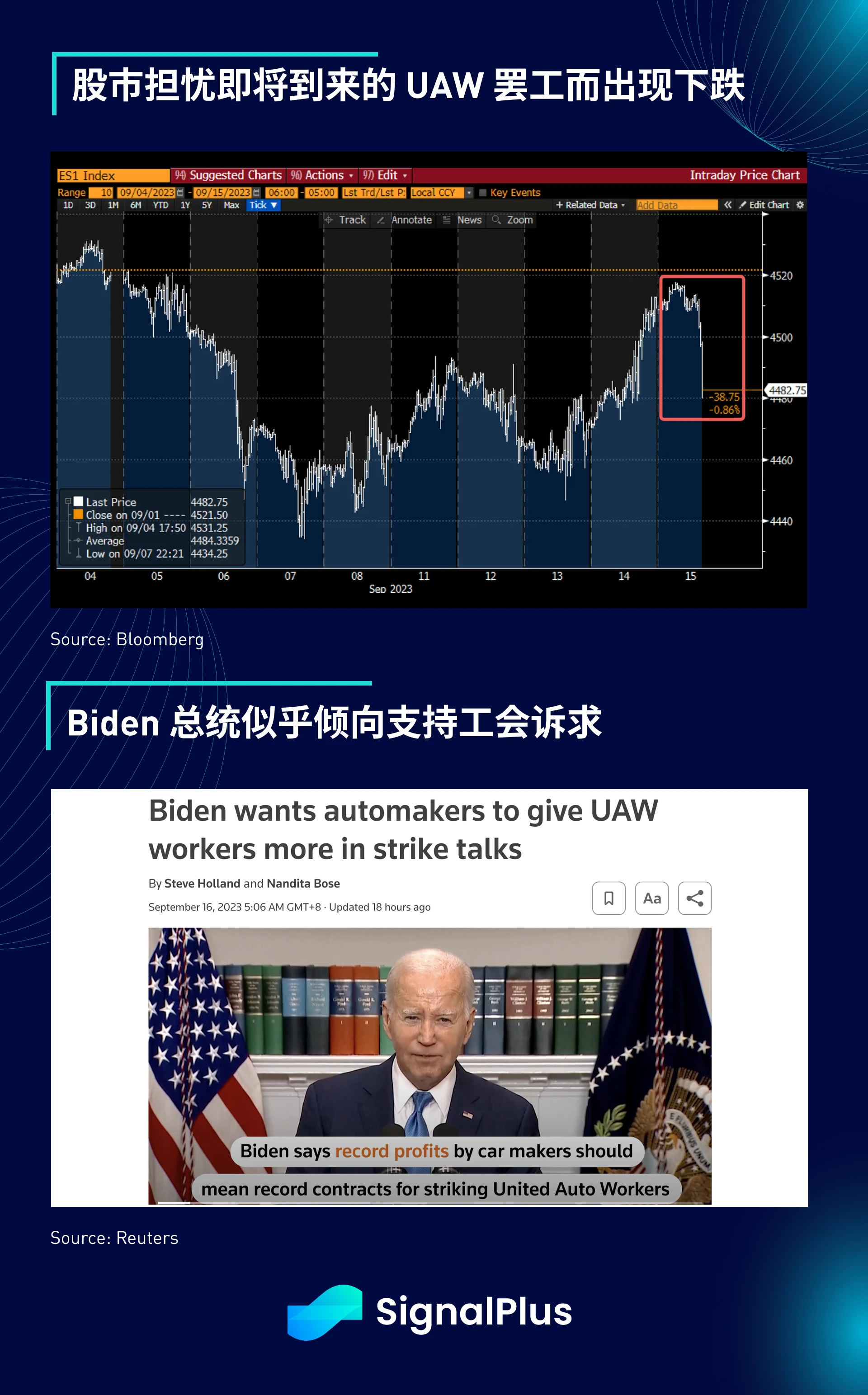 然而,周五股市出现反转,自纽约开盘后几乎直线下跌了 1.2% ,市场对美国汽车工人联合会 (UAW) 的大规模罢工行动表示担忧,这是该工会 88 年的历史上首次同时针对三大汽车制造商进行罢工,车辆短缺可能会在中期加剧通胀压力;UAW 的诉求较为激进,要求在 4 年内加薪 40% ,并减少工时至每周 4 天、共 32 小时,同时也要求生活成本和养老金调整等相关福利,这些都会导致汽车制造商的劳动成本上升且盈利能力下降;此外, Biden 总统似乎倾向支持工会工人这一点也令市场感到担忧,但考虑到 UAW 是唯一一个还没有对即将到来的 2024 年总统选举给出支持的主要工会,这个举动也不令人意外。