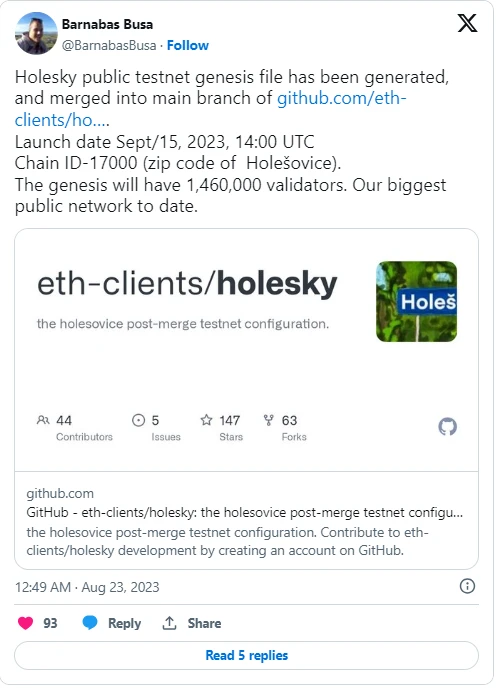 以太坊测试网络 Holesky(或可称为 Holešky,Holeše ovice)原计划于 2023 年 9 月 15 日上线(PANews 注:实际由于网络配置错误启动失败,将在 1-2 周内重启)。
