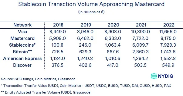 尽管存在中心化的诟病,并没有阻碍稳定币的受欢迎程度。这清楚地表明了对「链上美元」的需求不断增长,无论是作为可靠的价值存储、便捷的交换媒介,还是作为各种资产交易中的报价货币(例如 BTCUSDT) 。事实上,稳定币已经受到非常广泛的欢迎,其总交易量现已超过比特币,甚至即将超过第二大信用卡网络——万事达卡(WEEX 唯客注:2022 年万事达卡交易额为 8.175 万亿美元,稳定币交易额为 7.928 万亿美元)。我们承认这样一对一地进行比较可能不太恰当,但它为我们提供了有价值的见解。