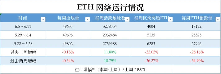 Etherscan 数据显示,过去一周以太坊网络出块量为 49742 个,环比下降 0.5% ;每周活跃地址数为 3553140 ,环比上涨 36.3% ;区块奖励收入为 3204 枚 ETH,环比下降 5.1% ;每周 ETH 销毁量达到 11678 个,环比上涨 2% 。