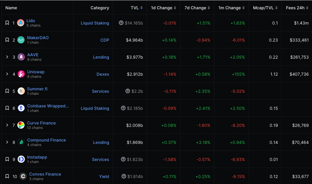 DeFiLlama 数据显示,上周链上锁仓抵押品价值从 212.6 亿美元上涨至 213.3 亿美元,环比微涨 0.5% ;从单个项目来看,锁仓价值前三名分别是: Lido 141.6 亿美元; MakerDAO 49.6 亿美元; Aave 39.7 亿美元;