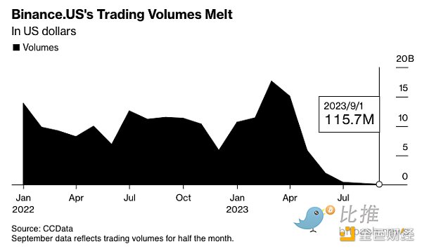 CCData 的数据显示,8 月份,Binance.US月交易量较2022 年 1 月下降了 98%, 刚超过2.86亿美元, 9月初至9月15日,Binance.US的交易额为 1.157 亿美元,因此,该平台的交易量 很可能在 9 月份进一步下降。