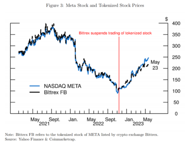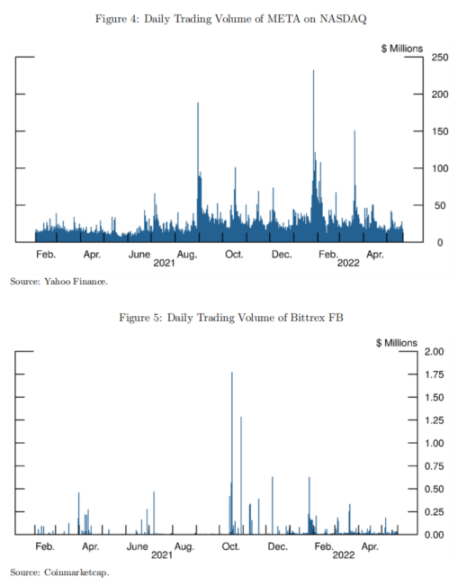 金融资产的代币化涉及证券、债券以及 ETF 这样的底层资产。与直接持有证券不同,代币化证券的价格和证券本身的价格可能不同,一方面是因为代币是 24/7 时限交易的,一方面是基于代币的可编程性和与 DeFi 的可组合性,能够为代币带来不一样的流动性。我们通过表 345 来展示 META 证券以及 MEAT 对应的证券代币价格的不同,以及交易量的不同(基于 Bittrex FB)。