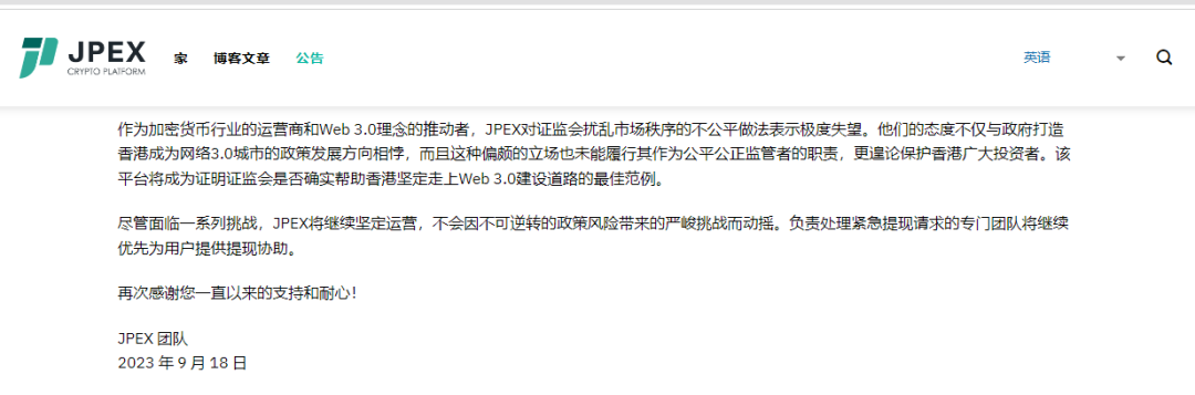 对于该点名,JPEX于当日在官网回应中声称“遭到证监会的不公平打压,导致我们考虑撤回在香港地区的牌照申请,并相应调整我们未来的政策发展。证监会还应对破坏香港加密货币发展前景承担全部责任。”从态度来看,JPEX显然表示不服,认为声称已申请交易所牌照的机构多不胜数,被公告只能证明证监会的歧视,而最后一句更是狂妄的指桑骂槐。