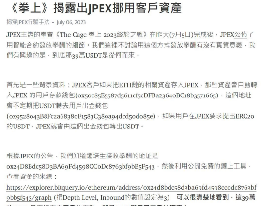 尽管疑点重重,但在肉眼可见的宣传与高额的活息诱惑下,众多散户投资者仍将金钱投入其中,这也因此让他们成为了事件受伤的主要人群。而早在6月,JPEX就已有前科。据一篇揭秘显示,6月JPEX在举办的《The cage 拳上2023最终之战》中公布智能合约发放拳赛奖励的细节,链上数据显示出其挪用客户资产39万USDT。网友辣评,“取之于户,用之于民”。