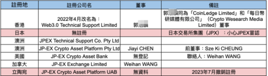 其宣称所获得的牌照就显得更为可疑。据《香港01》爆料,在多国公司登记处调查后,发现JPEX各地注册疑为「人头」登记,平台从2020年注册、2021年开始营运至今,在全球多个国家注册地的实际负责人、办公地点始终未公开。从注册公司而言,除了JPEX Technical Support的董事为郭浩麟外,并未深挖到任何关于创始人的线索,网传创始人为「币少爷」黄钲杰,但并未有实证。而其曾先后与天弓控股(0428)及hmvod视频(8103)两家上市公司实现合作,也让人怀疑是否有上市公司的注资背景。但今年4月,两家上市公司均已宣布停止该交易所的谅解备忘录合作。