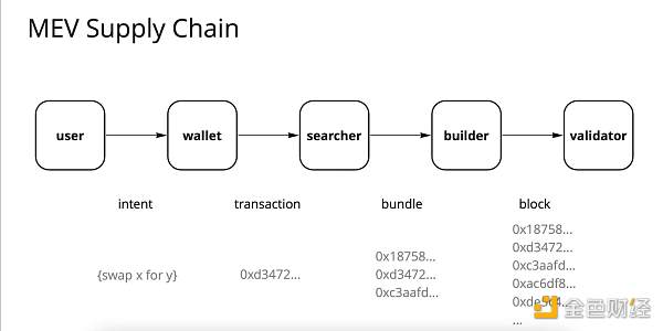 区块空间生产者是网络参与者,他们获取待包含的一组交易,并通过对它们排序实际将其构建为区块。这通常是给定链上验证者、矿工或挖矿池的角色之一。随着 MEV 协议的兴起,这种区块构建在很大程度上已外包给称为建造者的单独行为体。「MEV 供应链」现在非常复杂,涉及许多不同的行为体,如下图所示。