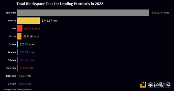 区块空间的需求可以有很大差异。Data Always 对 2022 年的区块空间需求做了很好的概述。下面是主要协议的区块空间费用表: