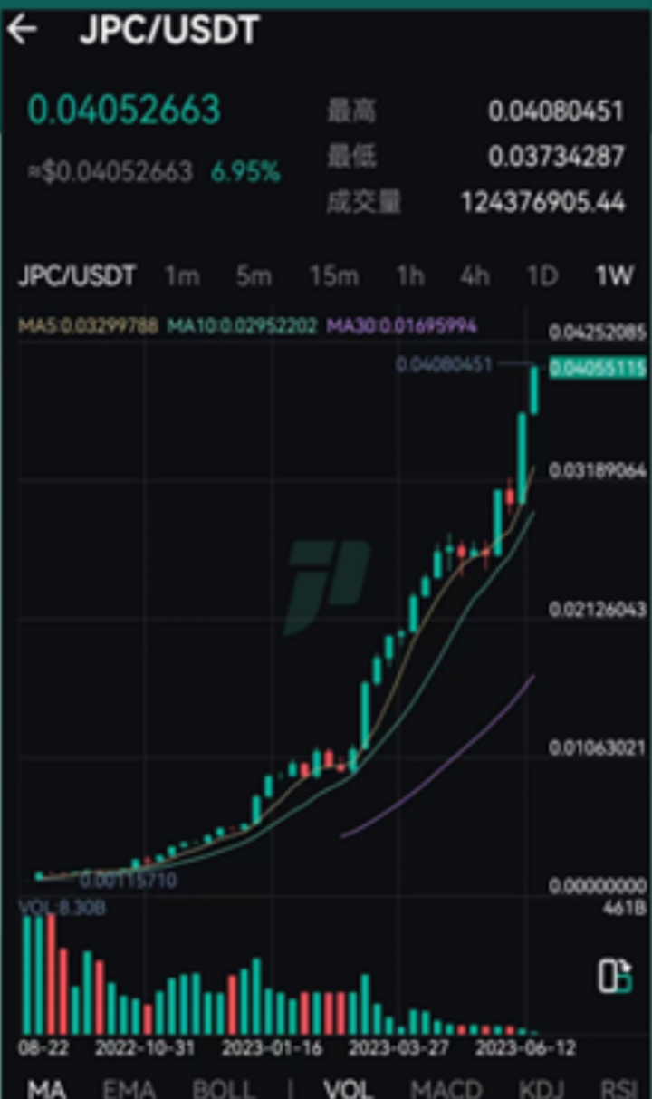 再次是平台自有虚拟币存在严重数据造假嫌疑。通过第三方数据检测平台就可以发现,JPEX 的平台币非常有趣,其在当前全球经济下行严重且加密市场普遍不太景气的情况下,逆势狂涨并且只涨不跌。从 2022 年 8 月 8 日上架的 0.001U 到 2023 年 6 月的 0.04U 直接翻了 40 倍,总市值高峰达到 1.88 万亿人民币之高。