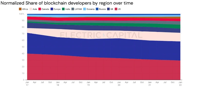 而美国以外的加密货币友好政策已经发挥作用,非美国地区正抢占美国的加密开发市场份额。 过去 5 年,美国的开发市场份额已流失到亚洲、非洲和拉丁美洲约 30% 。