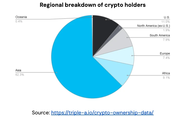 我不禁好奇,如果没有美国市场,加密产业真的能发展得这么大吗?然而事实是, 美国已经只占加密货币用户群的一小部分 :