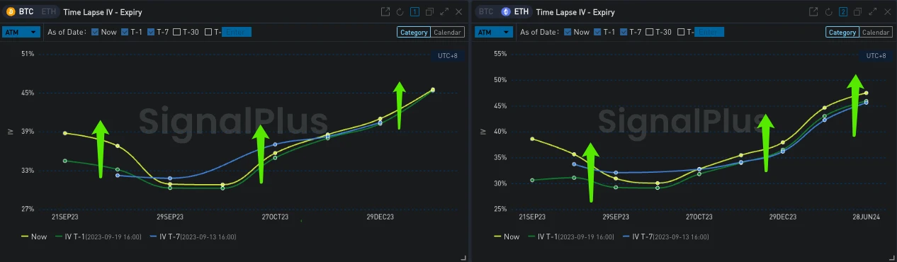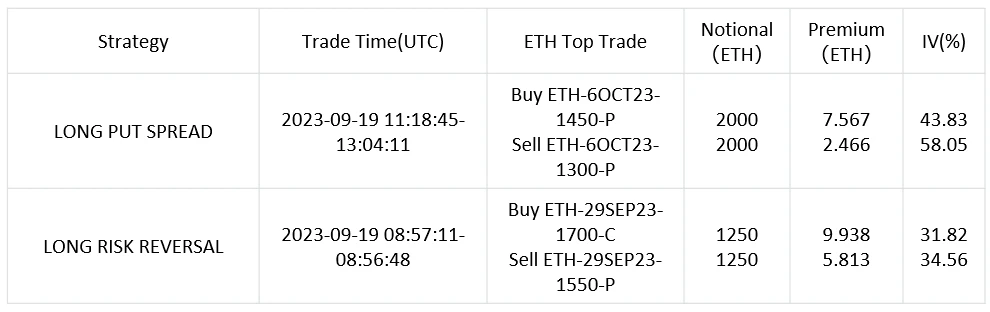 交易方面,过去 24 H 市场的成交主要集中在 6 OCT 23 之前的中短期限上,今晚 FOMC 可能的波动催生了一定的 避险情绪 ,BTC 九月份 Wing 上的 Call 被大量买入平仓,而 ETH 的 Put 也逐渐被购回。