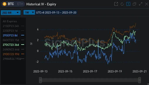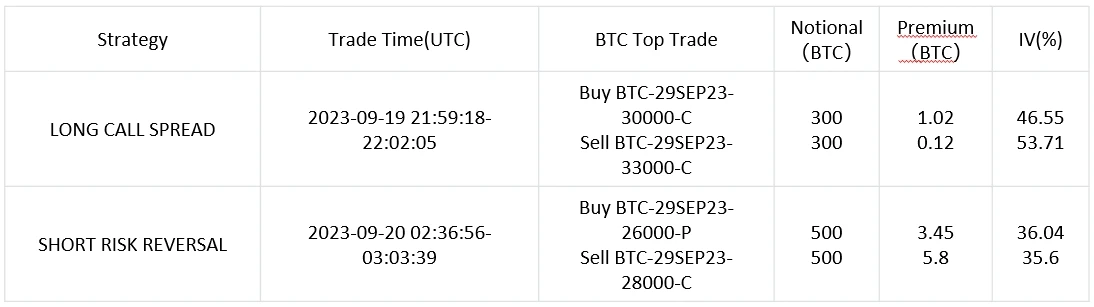 大宗交易方面,BTC 九月底往后的期限上累积成交了超过 2400 BTC Notional 的 Bull Call Spread ,持续看好 BTC 未来的上升空间。另一方面,正如昨天提到的,BTC 的 Skew 已经达到过去一个月的高点,为 Short Risky 组合提供了丰厚的 Vol Premium,过去一日,共计有 1250 BTC 的 29 Sep 23 26000 vs 28000 Short Risky 成交,使得该到期日的 RR 从峰值出现回落。