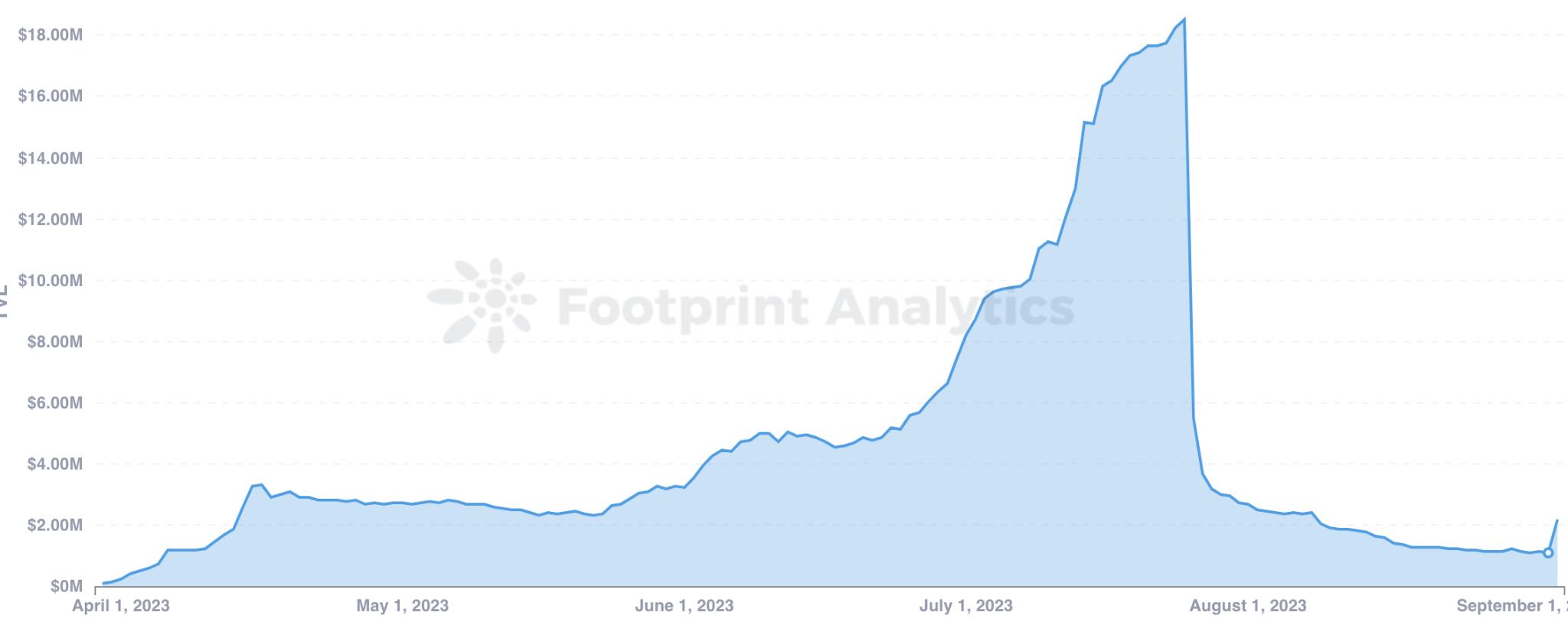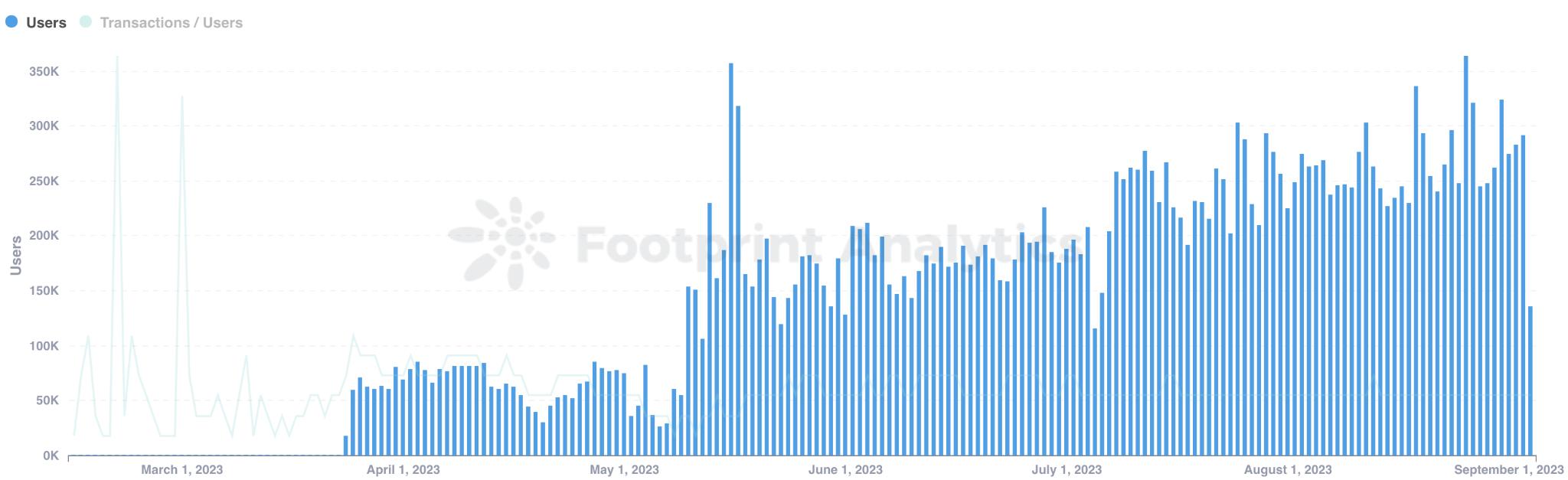 根据 Footprint Analytics 的数据,zkSync 在日活跃用户(DAU)方面出现了显著增长。2023 年 5 月 10 日,也就是上线约 47 天后,zkSync 的 DAU 达到了 15.35 万,标志着该平台的 DAU 首次突破 10 万。经过几个月的运营,zkSync 在 2023 年 8 月 26 日达到了最高的 DAU 记录,达到了36.38 万。这一上升趋势表明用户采用和兴趣都在大幅提高。