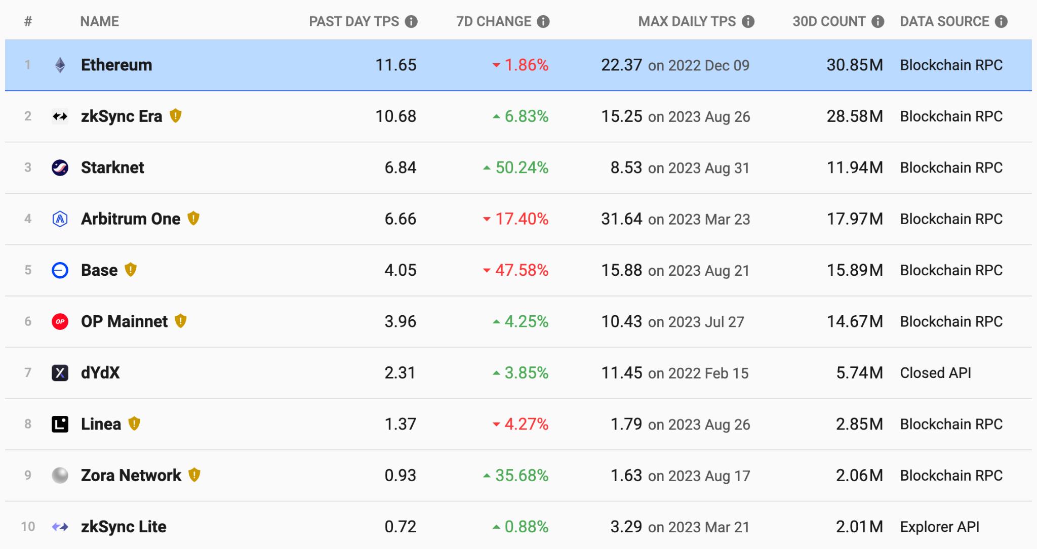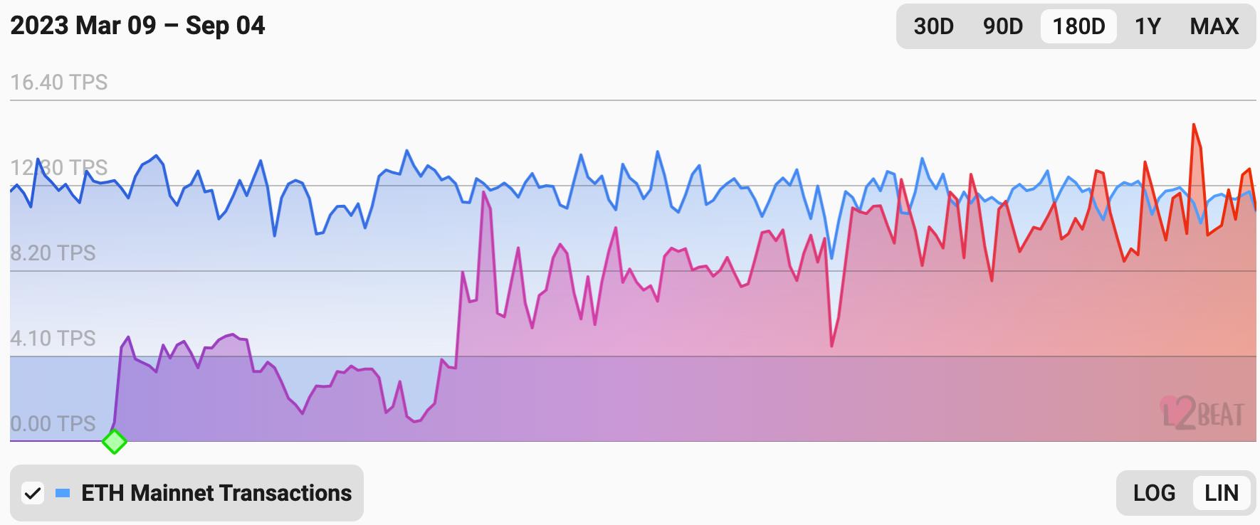 随着时间的推移,zkSync 的 TPS(每秒交易量)有了显著提高。3 月到 5 月的最初 TPS 低于 4,然后稳步增长,到 8 月时达到了 9 到 11 的范围。相比之下,以太坊在这段时间内的 TPS 保持在相对稳定的 12 到 14 范围内。这些进展表明 zkSync 有望在不久的将来超越以太坊的 TPS,成为区块链生态系统中具有潜力的可扩展性解决方案。