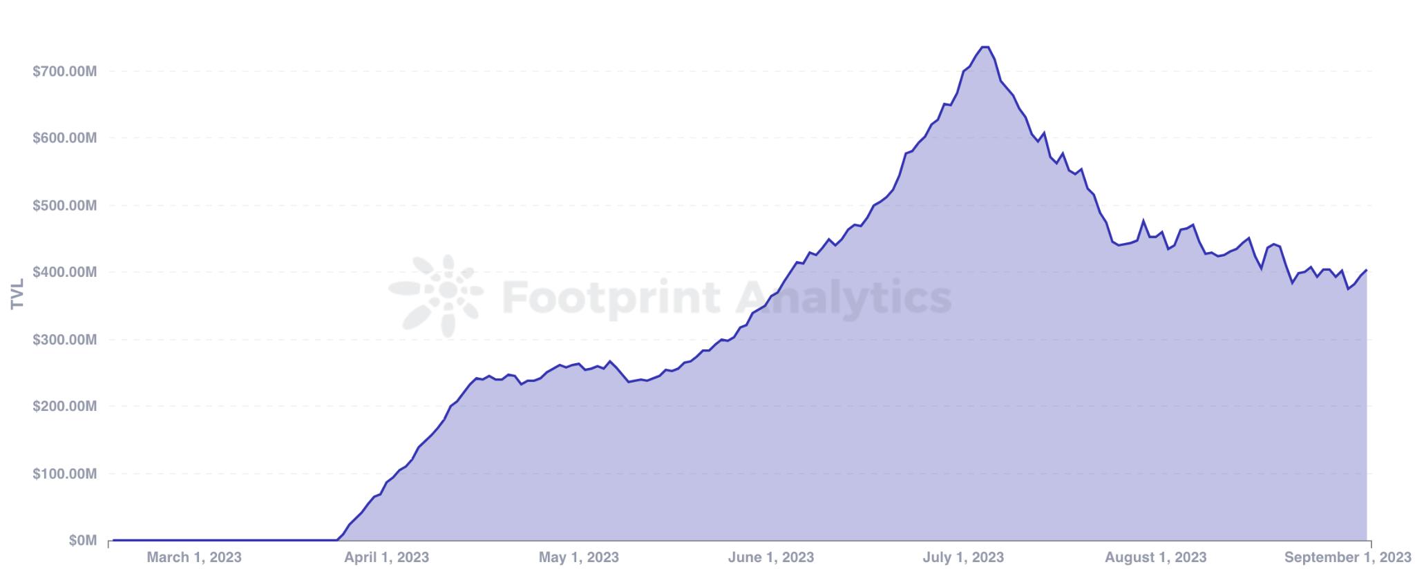 2023 年 3 月 24 日, zkSync 登陆主网,向所有用户开放,成为众多 zkEVM 正式上线主网的第一个。根据其 官方推特页面 的数据,仅在启动的前四天内,zkSync 就记录了超过一百万笔交易。在主网启动后仅 10 天的时间里,zkSync 的总锁定价值(TVL)就超过了 1 亿美元。此后,TVL 出现了大幅增长,并于 7 月 5 日达到了 7.36 亿美元的峰值。