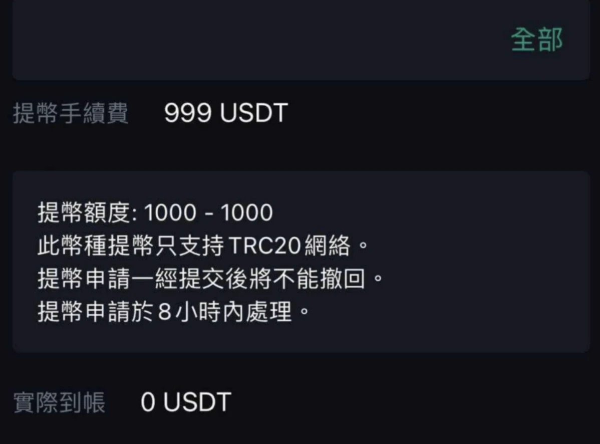 根据链上数据显示,在一段时间内,与 JPEX 有关的几个出金地址的确一度超过 7-8 小时没有任何资金转移纪录。而据 JPEX 官方 Discord 社区成员的截图显示,JPEX 交易所提币额度疑似被限制至 1000 USDT,但提币的手续费却高达 999 USDT,这意味着用户实际提现到手的只有 1 美元。