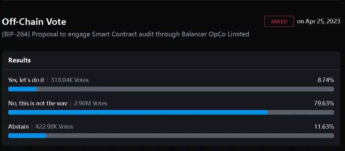 值得注意的是,今年 4 月,Balancer 治理在提案中更新了 Orb Collective 的财务计划,以续签 Certora 的智能合约审计合同,自 2023 年第二季度开始从 Orb Collective 的预算中分配给 OpCo,目的是保证 Balancer 用户的资金安全。但 Balancer DAO 社区成员以近 80% 的比例否定了 Balancer OpCo Limited 进行智能合约审计的提案,这也是在 7 条提案中唯一被否定的提案。