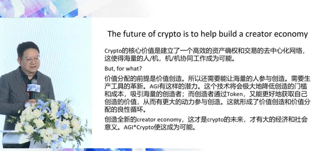我认为创作者经济肯定是未来经济的一个非常重要组成部分,甚至可以说是经济的核心特征。因此,加密货币的核心价值是建立一个高效的资产确权和交易的去中心化网络,这使得海量的人、机器和机器的协同工作成为可能。但是在价值分配之前必须有价值创造,因此如何让大量的人参与创造,如何让大量的 AI 之间更好地协同工作,如何解决激励机制的问题,如何解决资产交易和分配的问题,这都是非常关键的。因此,创造全新的参与创造权限的创作者经济,这才是未来的真正机会,这才具有重大的经济和社会意义,也才会成为经济的主流,而不是边缘。因此, AI、AGI 和加密货币使这种数字经济的未来成为可能,也是真正的 Web3。