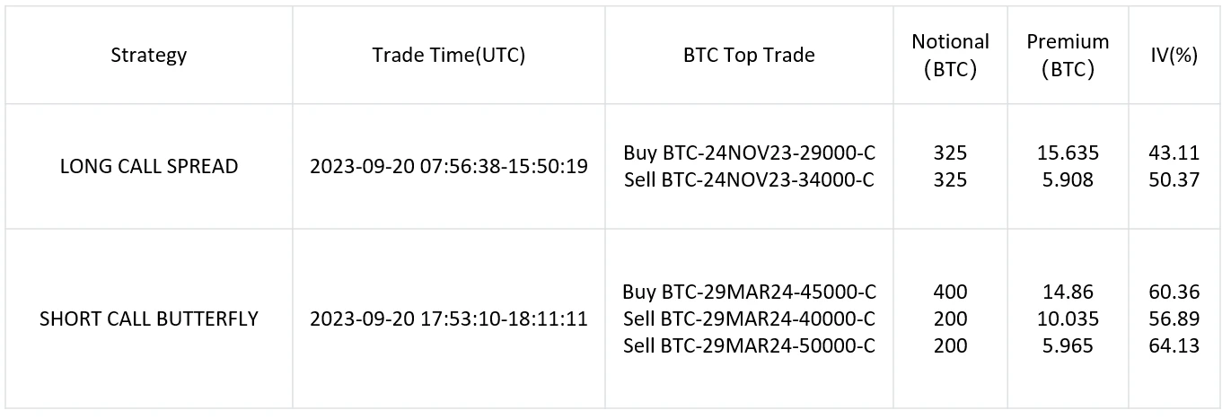 交易方面,过去 24 小时市场的交易量分布逐渐向中长期转移,投资者开始更多地关注长线投资策略。其中,十月底往后的远期买入 Call Spread 成了关注的焦点,累积成交额达到 1700 BTC/16800 ETH。