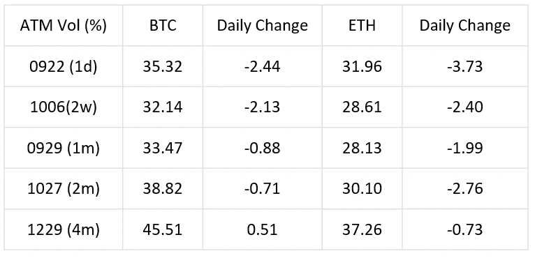 FOMC 过后,前端 IV 显著回落,BTC/ETH 九月底 ATM IV 分别降至 33.47% (-0.88% )/28.13% (-1.99% )。从中远端看,ETH IV 有所下降,相反 BTC 却略有升高,此变化加剧了 BTC 和 ETH 的 IV 差值,在流动性较好的十月/十二月底上,两者 ATM IV 差距均已超过 8% Vol,或为跨品种波动率套利策略提供了入场机会。