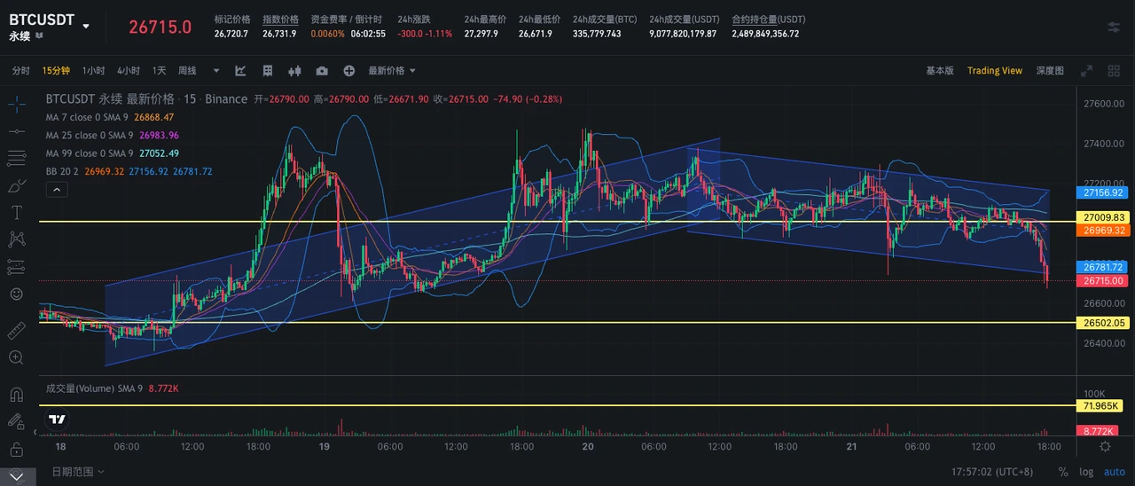 数字货币方面,BTC 结束了接连几日的震荡上行行情,并在昨日 FOMC 问答环节与美股风险资产一同短线下挫,跌幅达到 2% 左右。尽管价格在这之后迅速反弹并收复大部分失地,日间 BTC 价格走势仍处在缓慢下跌通道当中,今日交割收报 27003(-0.41% )。