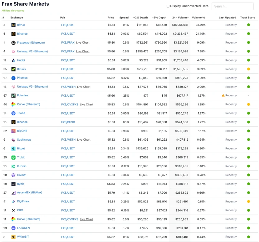 Frax 代币可在各大主流交易所进行交易,如下图所示。