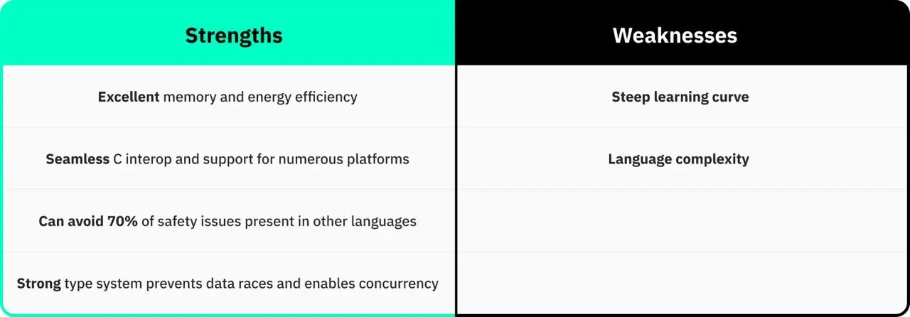 因此,Rust 是构建安全、健壮的区块链应用程序的绝佳选择。其高性能和低级控制让开发人员可以优化他们的代码。