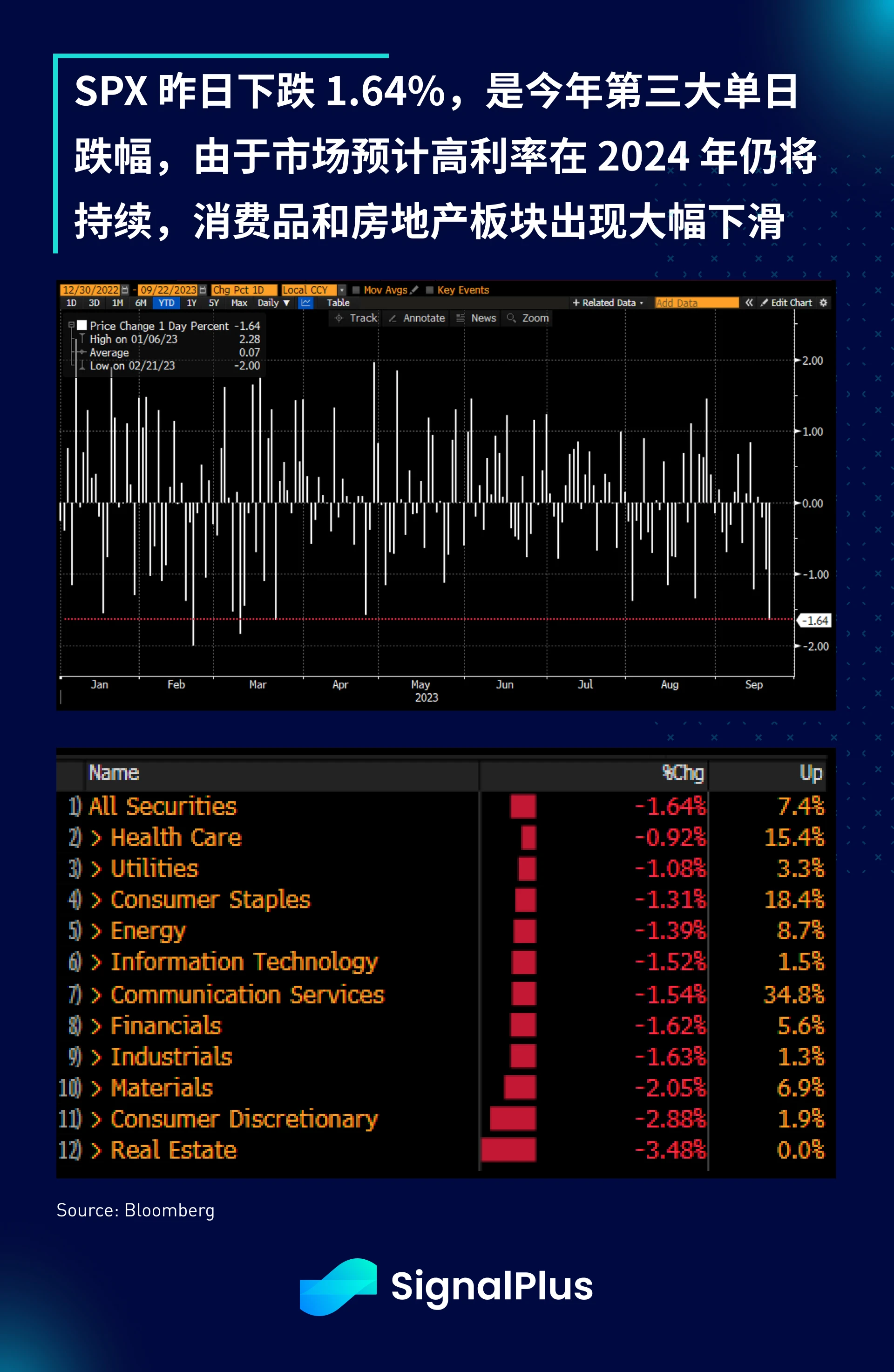 在前一天美联储进行了较为激进的点阵图调整后,对风险市场来说,“跟著点阵图走”已被证明是一种充满凶险的行为,投资人终于从长时间的自满中醒来,在 SPX 今年第三大单日跌幅(-1.6% )中,充分地感受到了 Powell “鹰派暂停加息”的余震,跌幅主要由消费品板块下跌 2.9% 以及房地产板块下跌 3.5% 所带动。