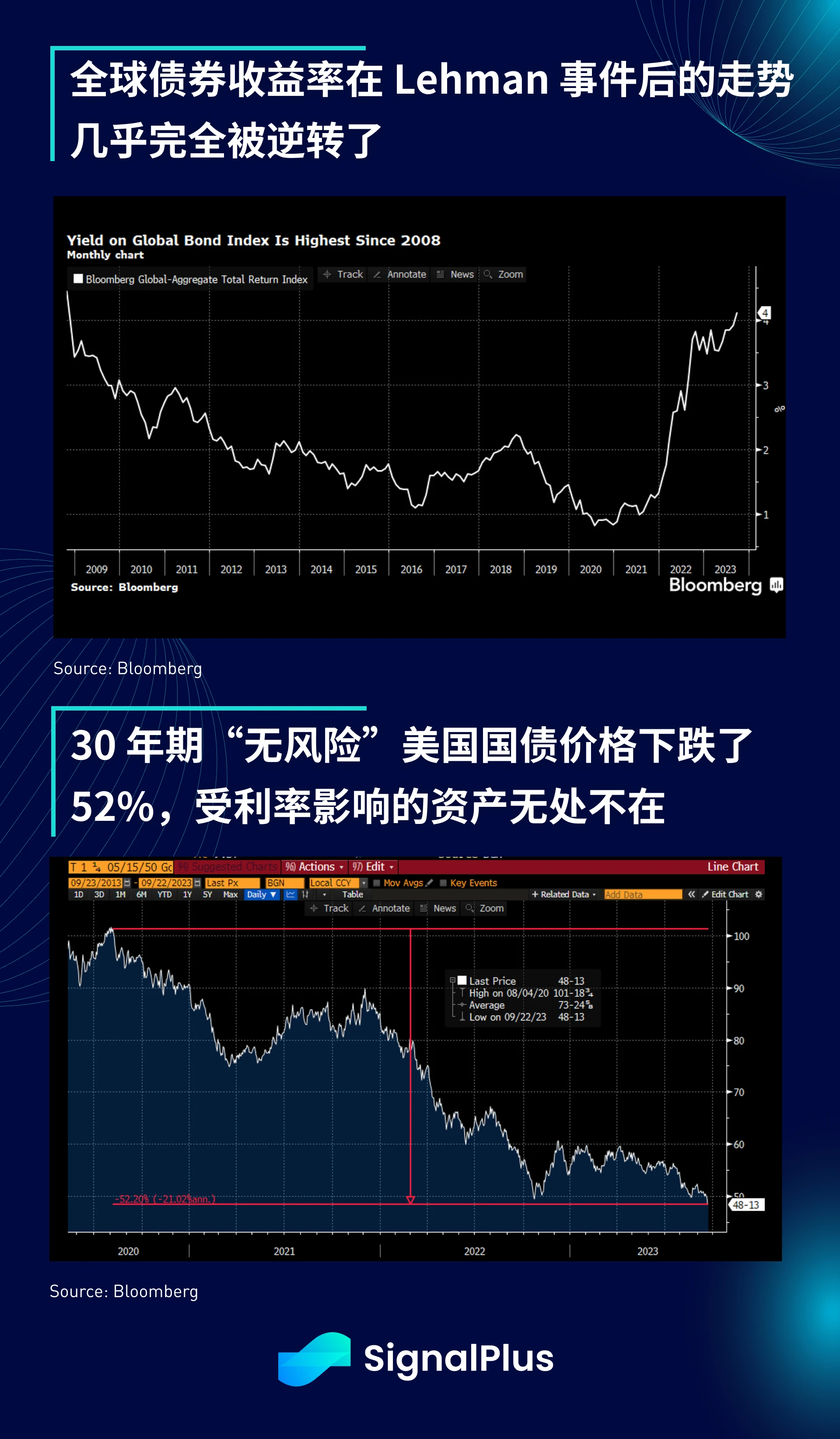 2 年期美债收益率攀升至 2006 年以来的最高水平(5.18% !),而 10 年期收益率则触及 15 年高点 4.50% ,全球收益率指数目前处于 2008 年以来的最高水平,而 2020 年发行的 30 年期长天期美债目前的交易价格为 48 美元,自拍卖以来价格下跌了 52% ,这可是无风险、美国政府发行的长期国债,在短短三年内损失了一半价值(由于久期的数学计算),是谁说债券交易很无聊的?