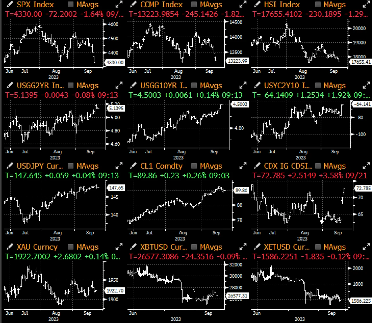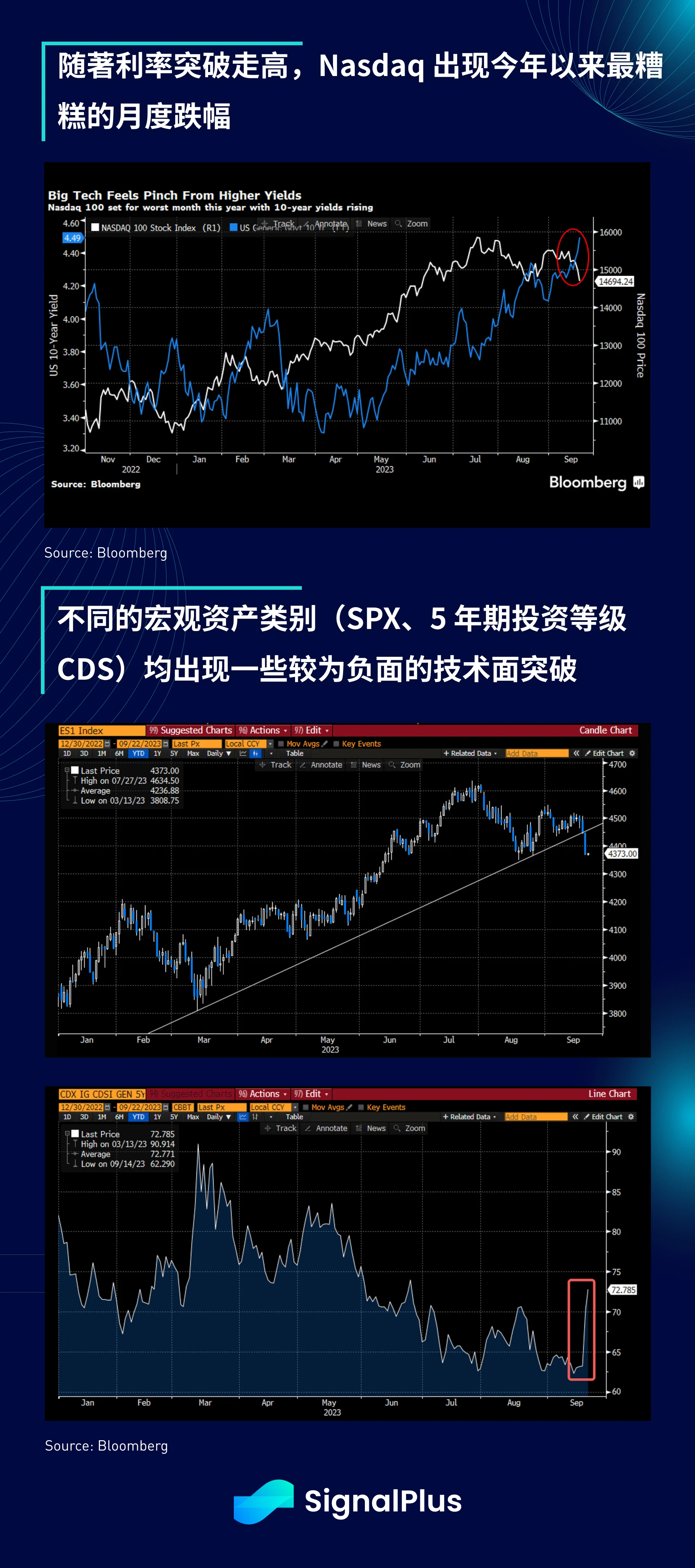 科技股终于对收益率飙升做出了反应,经历了今以来表现最糟糕的一个月,从技术面来看,SPX 打破了自 3 月以来的趋势线支撑, 5 年期投资等级 CDS 也强势上行,利差终于开始呈现与利率上升的正向关联,日圆似乎也很有机会跌破 150 ,而美元指数则似乎正准备进一步走高。