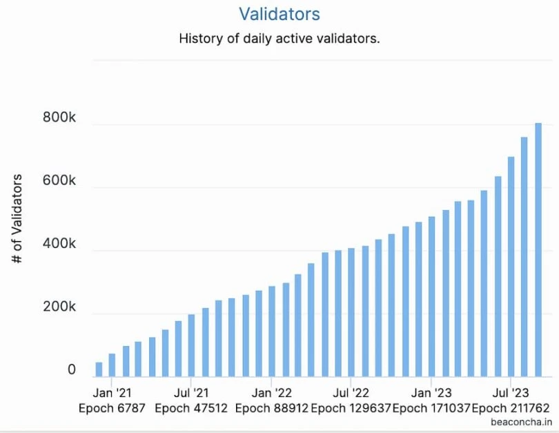 根据来自 beaconcha.in 的数据显示,当前以太坊质押量达到 2584 万枚,相较一年前合并(2022 年 9 月 15 日)前的约 1350 万枚增加逾 90% ,与此同时,活跃验证者数量从 49 万增加至目前的 80 万以上。