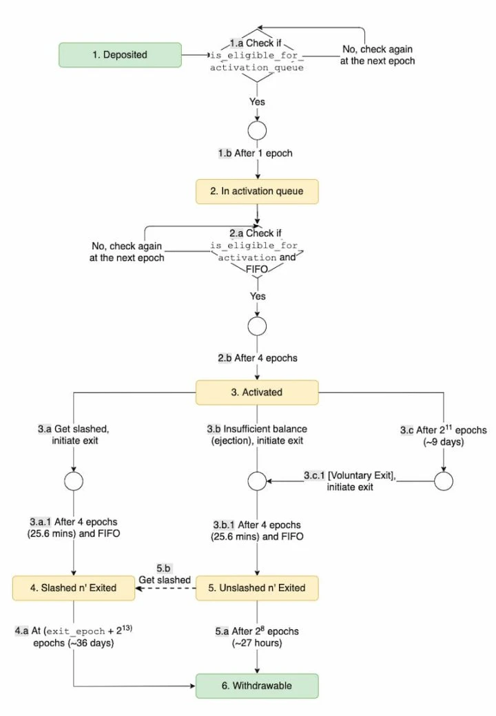 激活后,活跃验证者可以在经历 2 的 11 次方 Epoch(约 9 小时)自愿退出。在任何自愿或强制被退出中,在质押者可以提款之前,都会延迟四个 Epoch,如若验证者被罚没,需要经历 2 的 13 次方 Epoch(约 36 天)才能提款。如若验证者自行退出,需要等待 2 的 11 次方 Epoch(约 9 小时)才能提款。