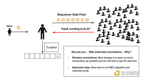 同样的风险不适用于Rollup(如今天实施的)。 几乎所有交易都是直接交易,因为用户与提议者(排序器)有直接通信连接。 搜索者几乎没有机会窃听通道,这显着增加了利用 MEV 机会进行待处理交易的难度。