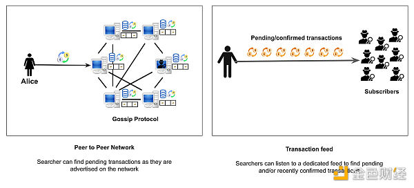 大多数用户在八卦协议上发送交易,希望提议者能够发现他们的交易并将其包含在他们的区块中。 与此同时,包括搜索者在内的任何人都可以加入八卦协议并侦听待处理的交易。