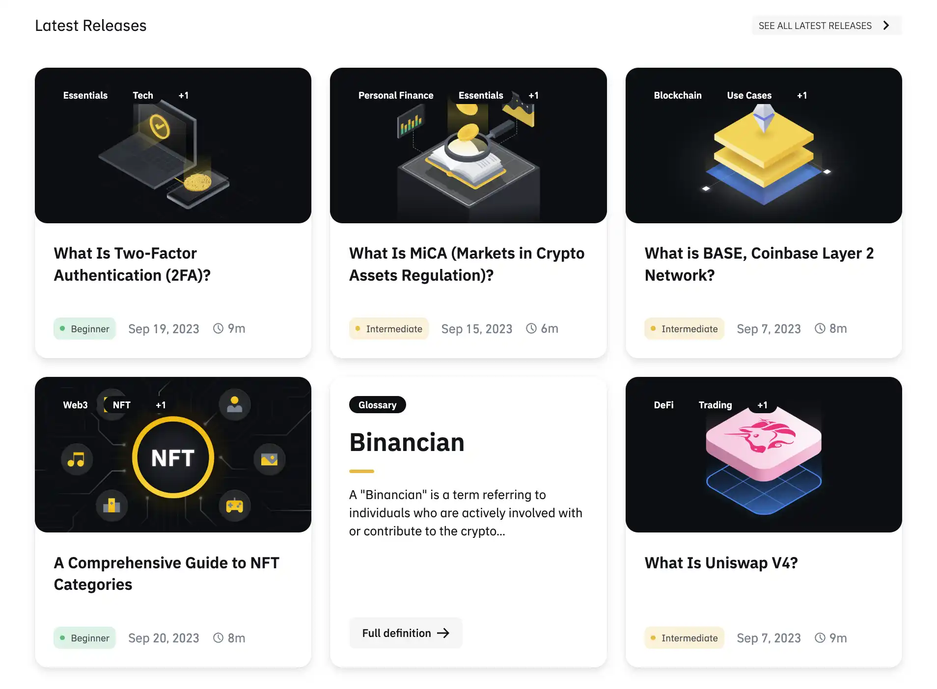 作为加密世界 CEX 的龙头,Binance 也有自己的教育平台——Binance Academy。这里也有课程和教学内容的推出,但从网站导航栏的「Learn & Earn」、Partnership 就可以看出,Binance Academy 相比于 Uniswap University 最大的不同在于生态更加复杂,想要的也更多。