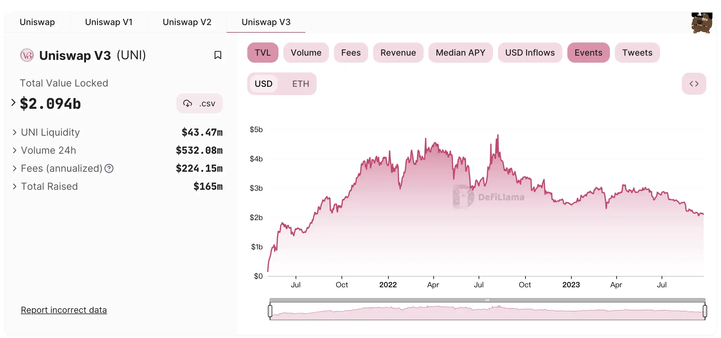 但随着越来越多成长起来的 DEX 争夺市场份额,一家独大注定无法持续,这意味着继续优化 DEX 并挤压现有市场的增长将不足以继续其目前的轨迹。最直接的表现是,Uniswap 的流动性持续不足。
