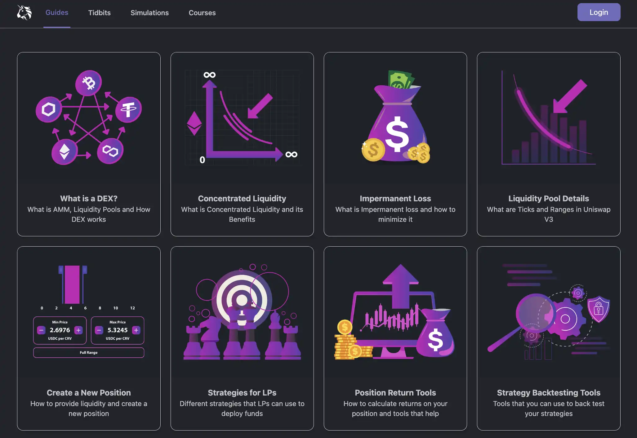 模拟(Simulations): 这部分就到了要深入实践学习的阶段。在这个版块里,你可以练习添加、删除流动性等场景,还可以探索高级头寸管理工具,这里相当于一个视频教程,每一步操作都有演示,相比于看文字教程,视频形式对加密小白更友好。