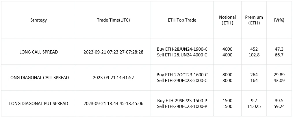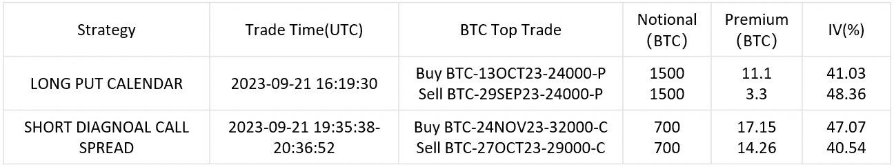 过去 24 小时的大宗策略交易以日历价差策略为主。其中 BTC 近期 Put/Call 均遭到抛售,并为中远期多头建仓提供了 premium 支持。ETH 方面,看涨价差 27 OCT 1600 C vs 29 DEC 2000 C 以单笔 8000 ETH per leg 的庞大数量成为焦点,除此之外,以 29 SEP 1500 P vs 29 DEC 1000 P 为代表的三角价差策略也收受到交易员的青睐,为高利率下承压下行的以太价格提供了保护。