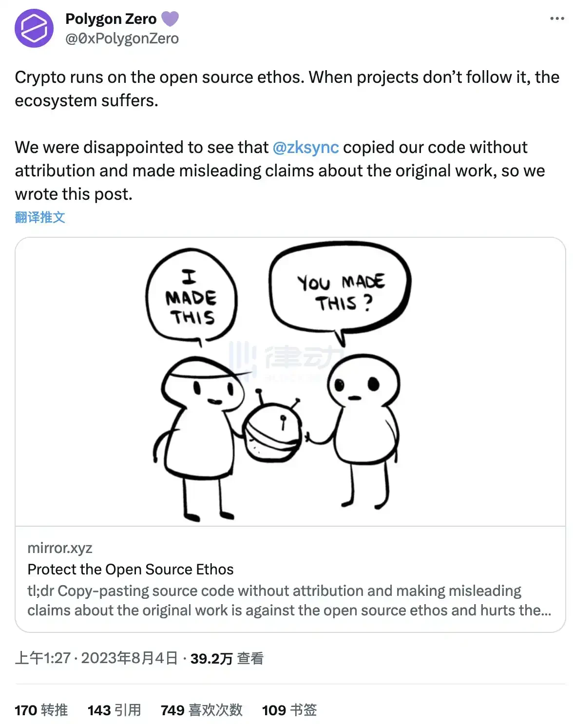 此外,在上个月初, Polygon 官方旗下零知识证明团队 Polygon Zero ,在一篇名为 《保护开源精神》 文章中,公开批评 zkSync,称其未经许可地复制了 Polygon 的开源代码,并发布误导性言论,一时之间引发了行业内的广泛关注。
