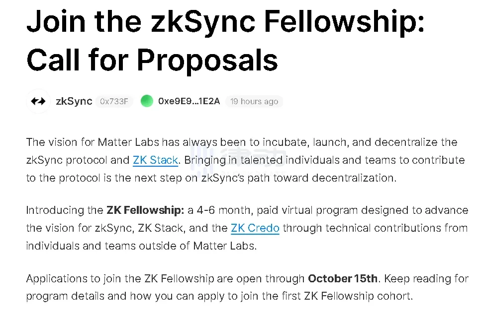 而另一边,相较于准备充分的 Consensys,zkSync 的 Fellowship 计划显得较为「粗糙」,除了有一张主题清单外就没有多余的信息。Consensys 在官推中附上了专为 Fellowship 计划设计的网页以及申请方法,而 zkSync 仅有一篇文章。