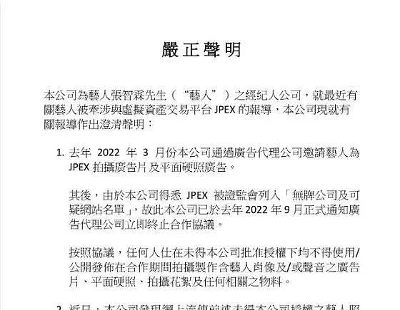 甚至连娱乐圈知名艺人张智霖都被涉及牵连,不得不连夜赶回,前往警局为此事件配合调查并进行“录影会面”,其本人及经纪公司对外澄清表示,并未参与任何投资,碍于早年 JPEX 成立时,为大力宣传其在香港的影响力,曾寻求过张智霖等人的帮助,但对于所拍摄的广告内容,张智霖所属经纪公司早在 2022 年 5 月时,就已经以书面形式通知了 JPEX 一方,要求对方在未取得香港“牌照”之前,不得使用张智霖的肖像用于任何宣传,并保留向 JPEX 追究责任的权利。