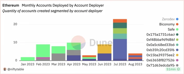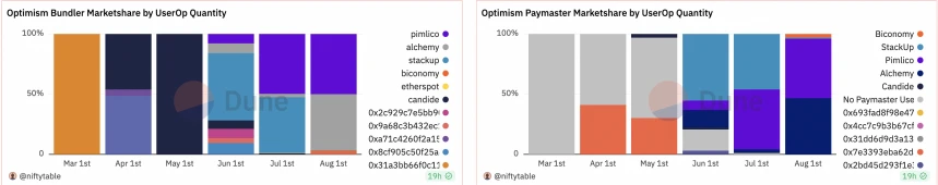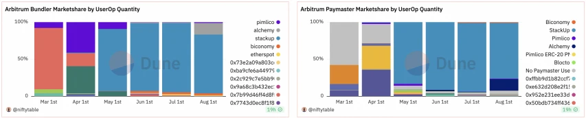 • 发展数据:以太坊、Arbitrum、Optimism 和 Polygon 已部署超过 52 万个 AA 账户,其中 80% 以上的账户在 7-8 月刚刚创建,大多为 Polygon 和 Optimism 两条链借着 AA 产品的推出达成大幅增长。Bundler 和 Paymasters 目前在做的协议较少,目前各个链上都被 Pimlico、StackUp 等项目垄断。