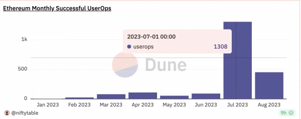 ▪ Stackup 各链都有 bundler 业务,Arbitrum(8 月 5 ETH)和以太坊(7 月 0.4 ETH)上盈利领先。bundler 处于失败的多但是赚得也多的状态;