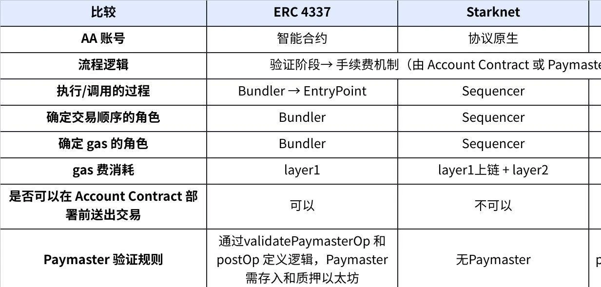 ○ 原生账户抽象方案: Starknet 和 zkSync 两条链支持原生的账户抽象,区别于 4337 方案。差异:Starknet 无 Bundler 和 Paymaster,由 Sequencer 确定交易顺序、支付 gas 并执行,zkSync 通过 Operator 确定交易顺序、支付 gas,再调用 bootloader 一起操作;